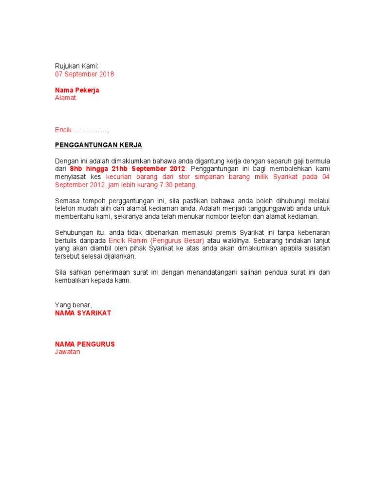 Sebarang kenaikan atau perubahan gaji jika perlu akan dibincangkan bersama dengan pihak pengurusan syarikat. Contoh surat rasmi gantung kerja sambilan contoh surat rasmi gantung kerja sampingan contoh surat rasmi gantung kerja online contoh surat. Dengan ini adalah dimaklumkan bahawa anda digantung kerja dengan separuh gaji bermula dari 8hb hingga 21hb september 2012.